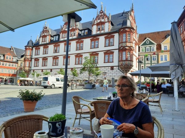 Am "Ferkelbrunnen" genießen wir Cappuccini im Schatten.