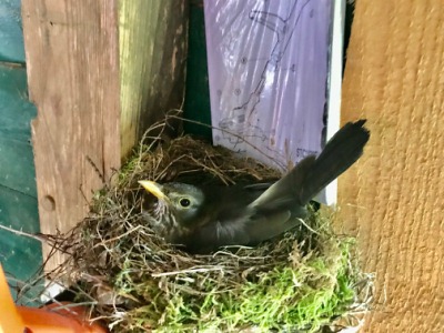 über dem Trimmer ein Nest gebaut und sitzt.